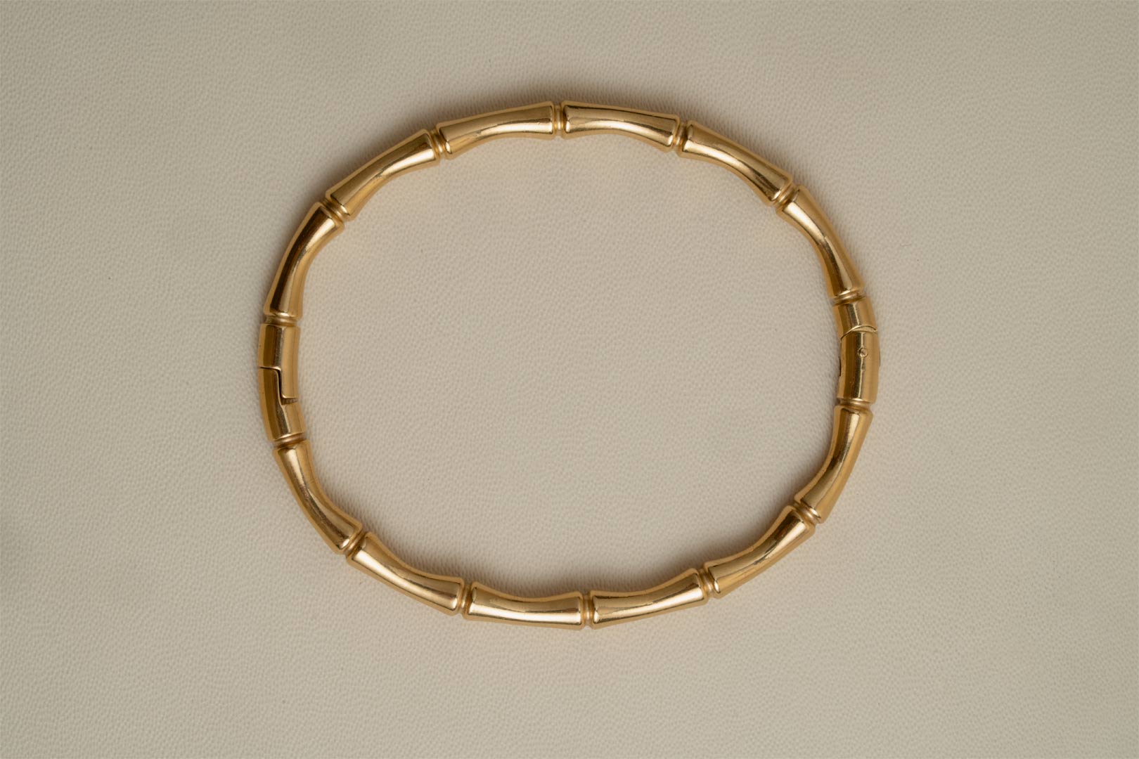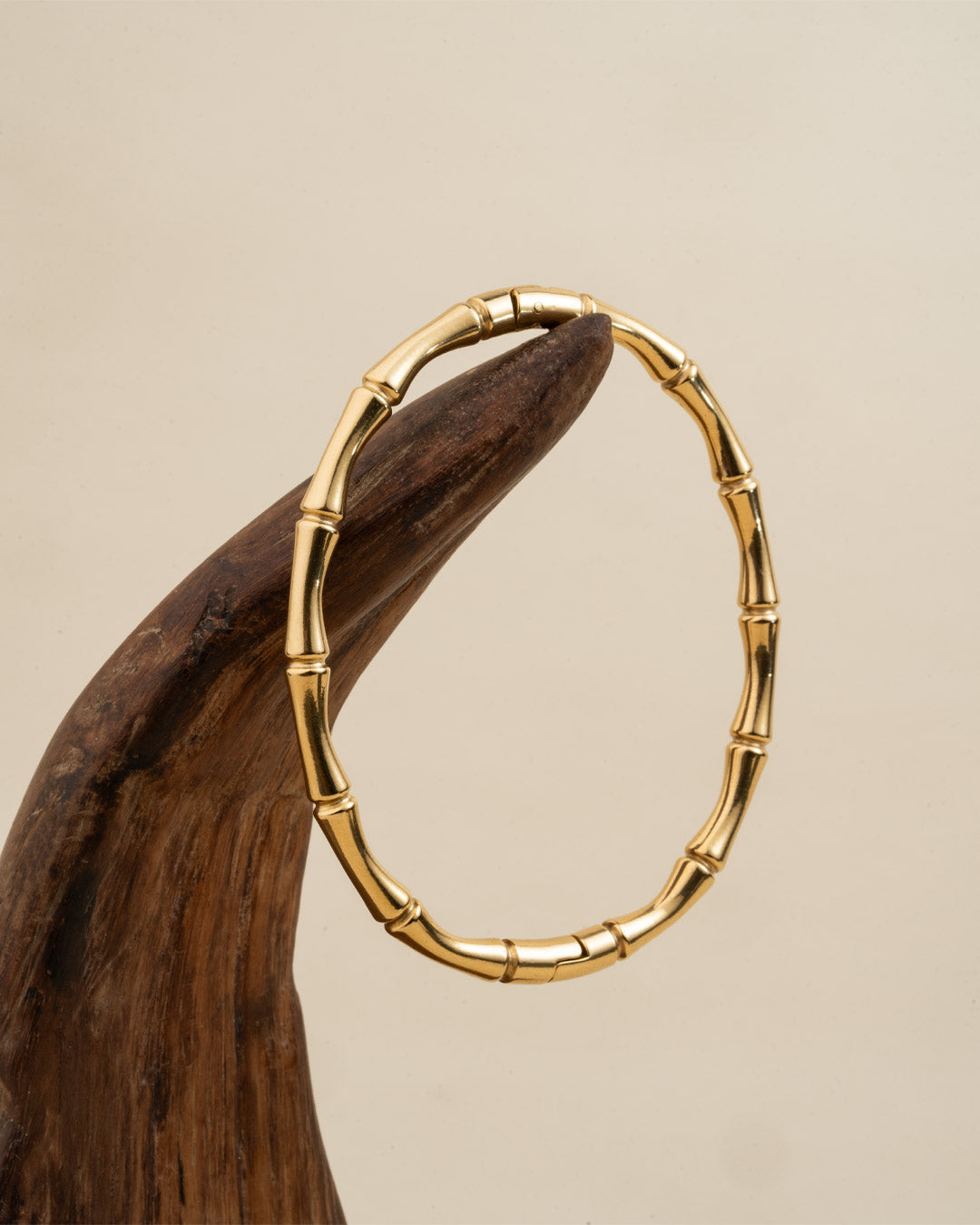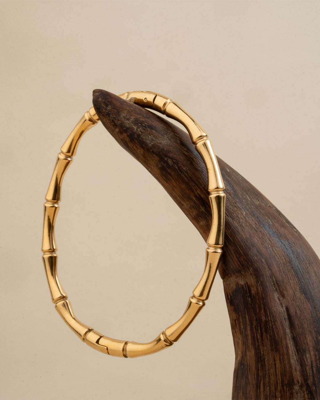 Inspired by nature, designed for elegance. This golden bamboo-style kada combines minimal lines with timeless charm. Its sleek, textured finish adds a touch of luxury to your everyday look — from brunch to evening glam.