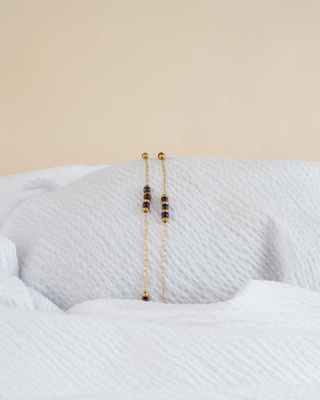 A perfect mix of earthy and elegant. This anklet features warm brown beads intertwined with a sleek golden chain, creating a subtle shimmer that complements every skin tone.