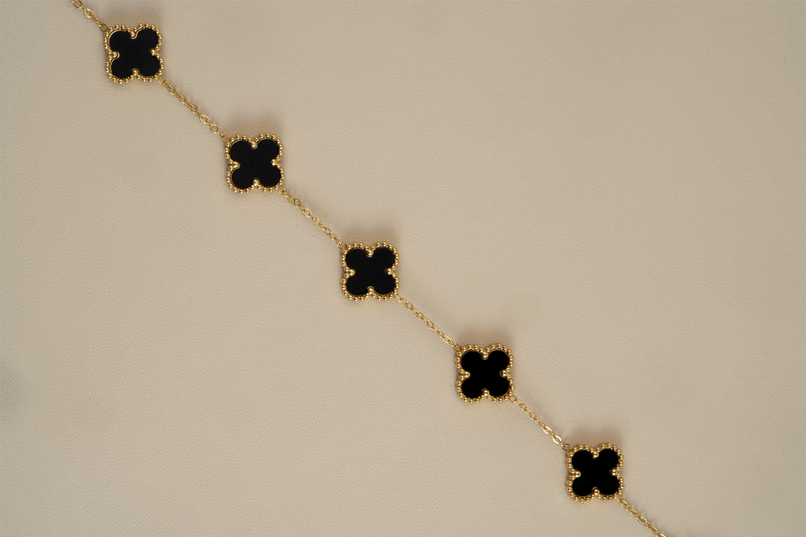 Elegant and timeless, the Gleam Clover Bracelet features black clover charms set in a gold finish. Perfect for everyday wear or special occasions, it adds a touch of luxury and charm to any look.