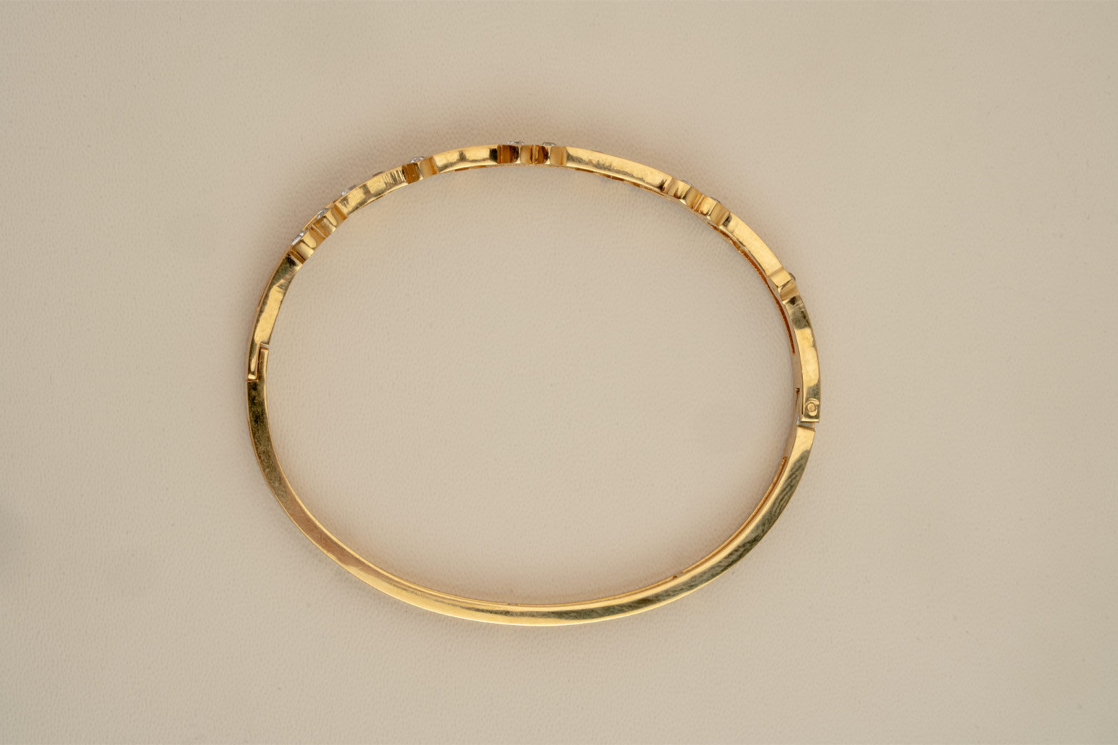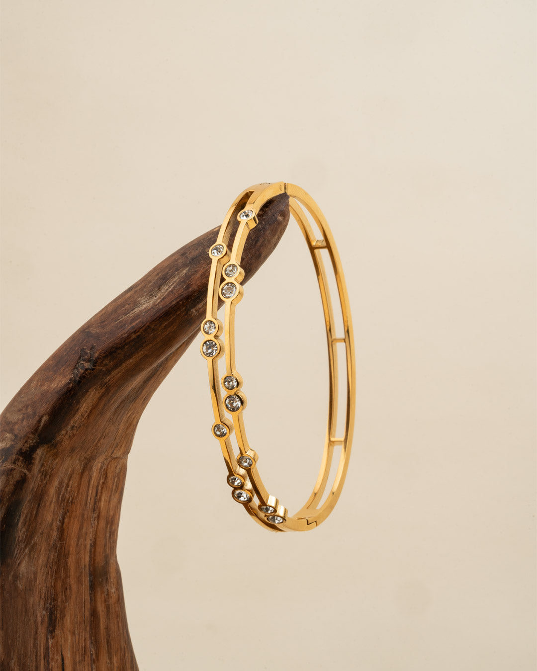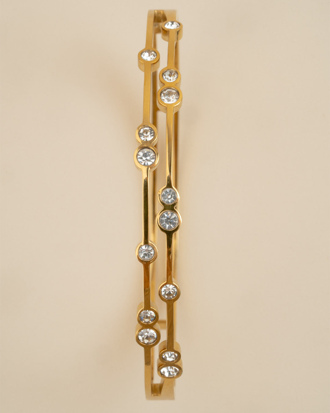 Subtle sparkle, timeless shine. This elegant kada features diamond-inspired stones delicately embedded along its golden band, giving you a soft yet luxurious glow.